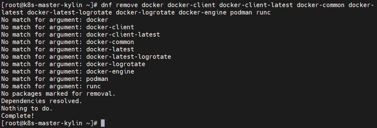 [root@k8s-master-kylin ~]# dnf remove docker docker-client docker-client-latest docker-common docker-latest docker-latest-logrotate docker-logrotate docker-engine podman runc