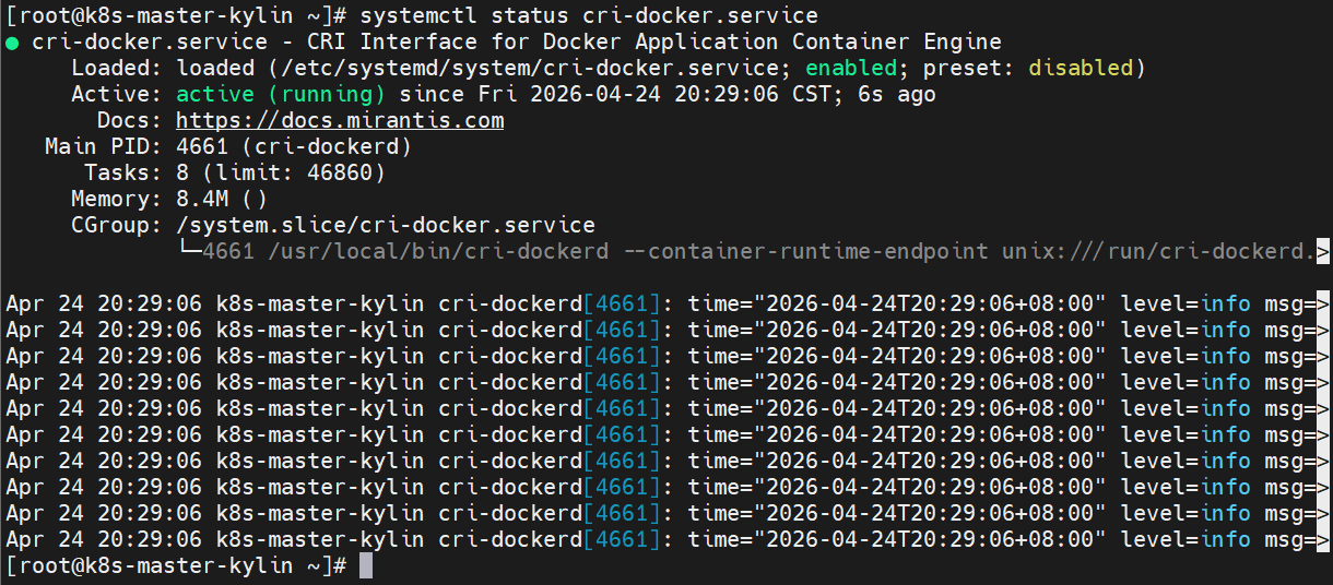 [root@k8s-master-kylin ~]# systemctl enable --now cri-docker.service[Step6] 验证:查看cri-dockerd的服务状态。