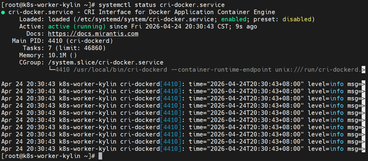 [root@k8s-worker-kylin ~]# systemctl enable --now cri-docker.service[Step6] 验证:查看cri-dockerd的服务状态。