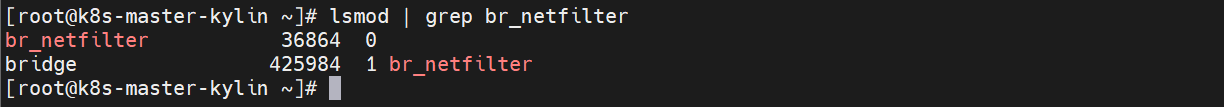 [root@k8s-master-kylin ~]# modprobe br_netfilter[Step3] 验证:查看模块是否加载,有回显结果表示已加载。