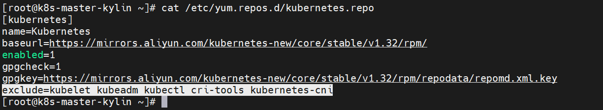 [root@k8s-master-kylin ~]# systemctl enable --now kubelet.service[Step4] 为了确保软件包的版本不会自动升级,在仓库文件中添加exclude参数,防止因为误升级导致的问题。