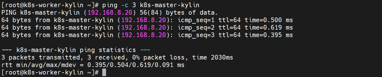 [root@k8s-worker-kylin ~]# ping -c 3 k8s-master-kylin