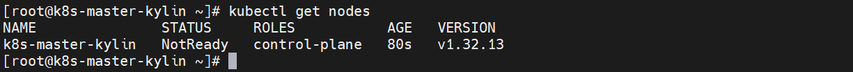 [root@k8s-master-kylin ~]# sudo chown $(id -u):$(id -g) $HOME/.kube/config[Step6] 验证:查看集群中所有节点的状态、角色和版本信息,k8s-master-kylin节点的状态为“NotReady“是因为还没有部署网络插件。