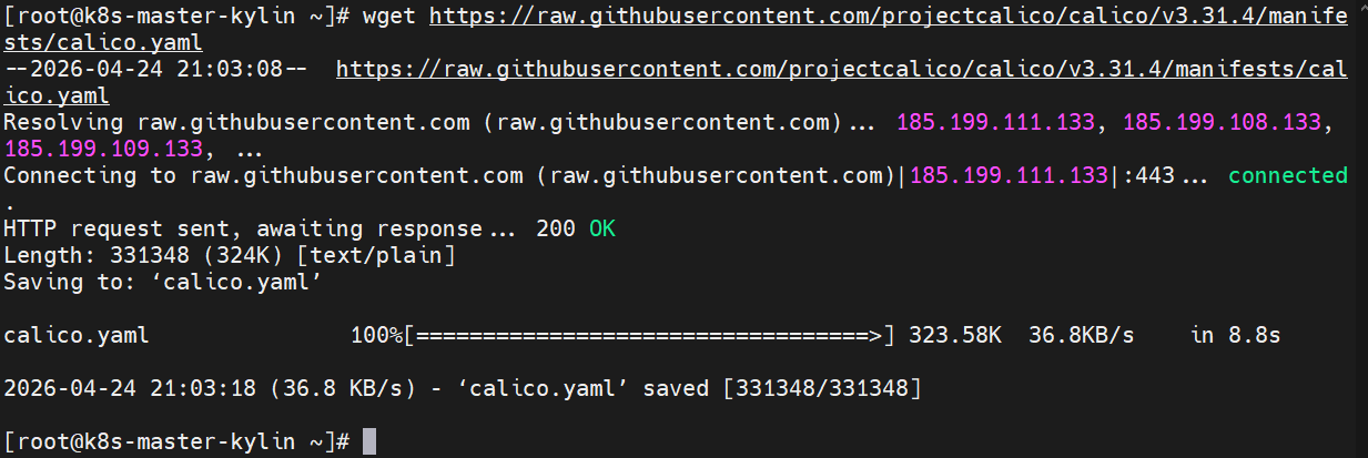 [root@k8s-master-kylin ~]# wget https://raw.githubusercontent.com/projectcalico/calico/v3.31.4/manifests/calico.yaml