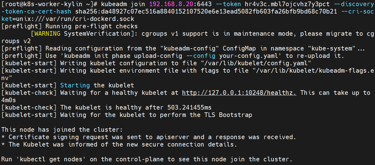 [root@k8s-worker-kylin ~]# kubeadm join 192.168.8.20:6443 --token hr4v3c.mbl7ojcvhz7y3pct --discovery-token-ca-cert-hash sha256:da48927c07ec516a8840152107520e6e13ead5082fb603fa26bfb9bd68c70b21 --cri-socket=unix:///var/run/cri-dockerd.sock
