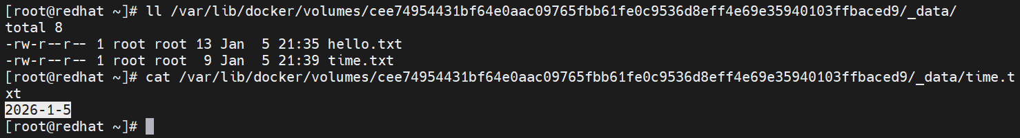 [root@redhat ~]# cat /var/lib/docker/volumes/cee74954431bf64e0aac09765fbb61fe0c9536d8eff4e69e35940103ffbaced9/_data/time.txt
