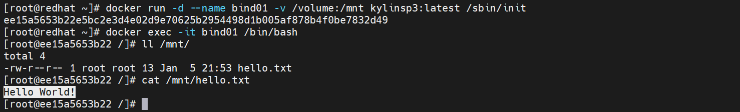 [root@redhat ~]# echo "Hello World!" > /volume/hello.txt[Step2] 基于kylinsp3镜像创建一个容器bind01,将/volume目录挂载到容器中。随后登录容器,能够读取目录中内容。
