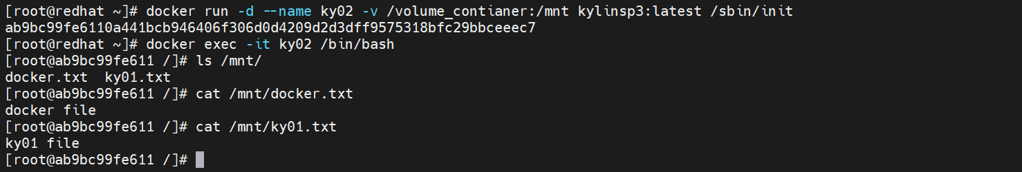 [root@redhat ~]# docker run -d --name ky02 -v /volume_contianer:/mnt kylinsp3:latest /sbin/init