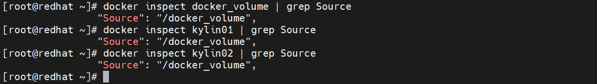 [root@redhat ~]# docker run -d --name kylin02 --volumes-from docker_volume kylinsp3:latest /sbin/init[Step4] 分别查看docker_volume、kylin01和kylin03三个容器的挂载信息,可以看到三个容器的卷挂载信息都是一致的