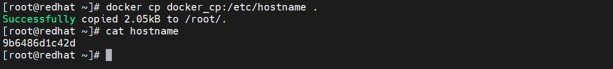 [root@redhat ~]# docker cp docker_cp:/etc/hostname .