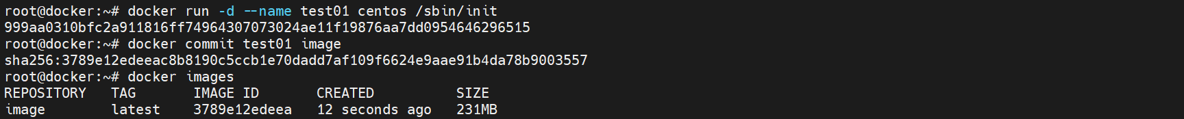 root@docker:~# docker run -d --name test01 centos /sbin/init[Step2] 将创建的容器保存镜像“image”。