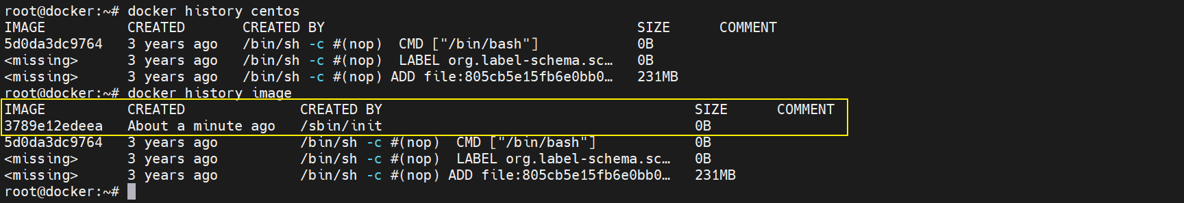 root@docker:~# docker history centos
