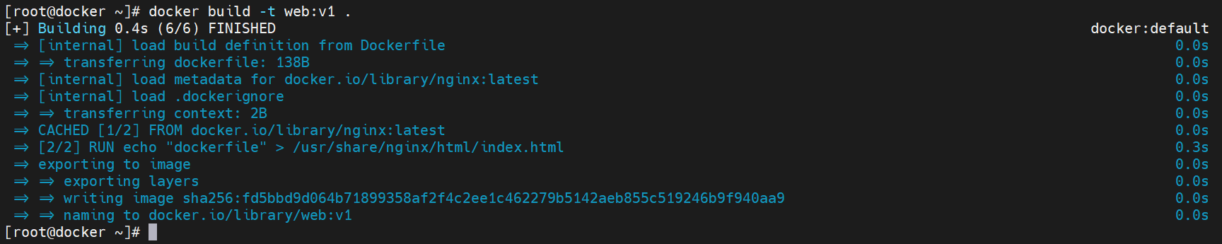 RUN echo "dockerfile" > /usr/share/nginx/html/index.html [Step2] 使用Dockerfile构建镜像,镜像命名为web:v1。
