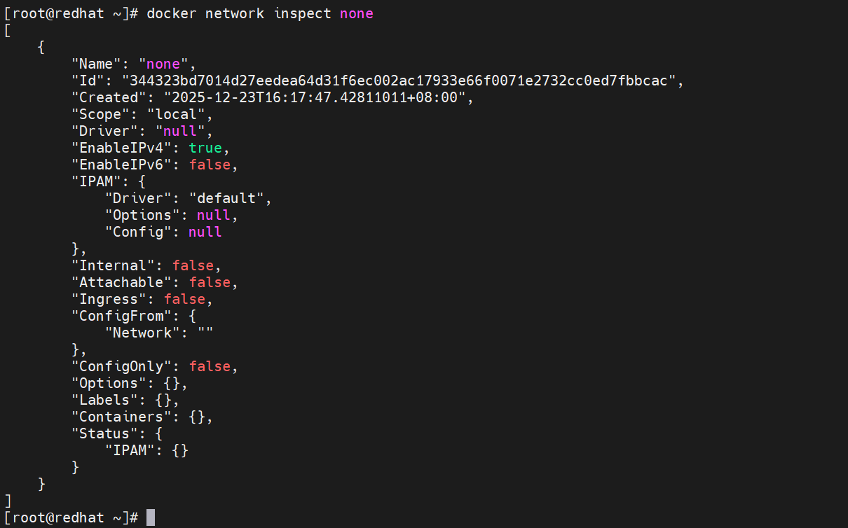[root@redhat ~]# docker network inspect none