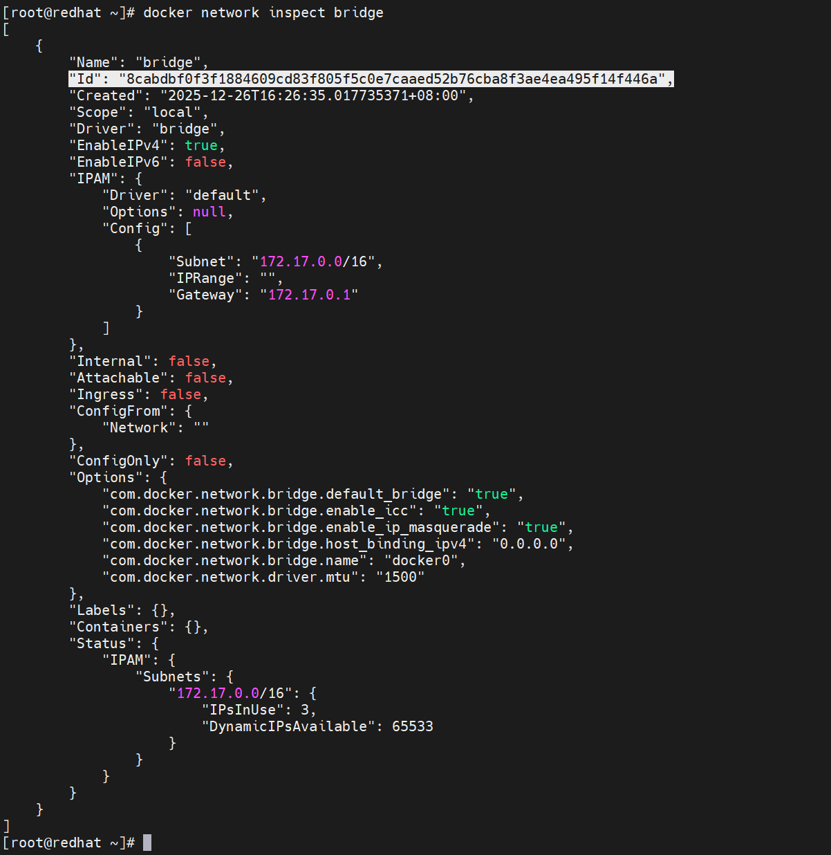 [root@redhat ~]# docker network inspect bridge
