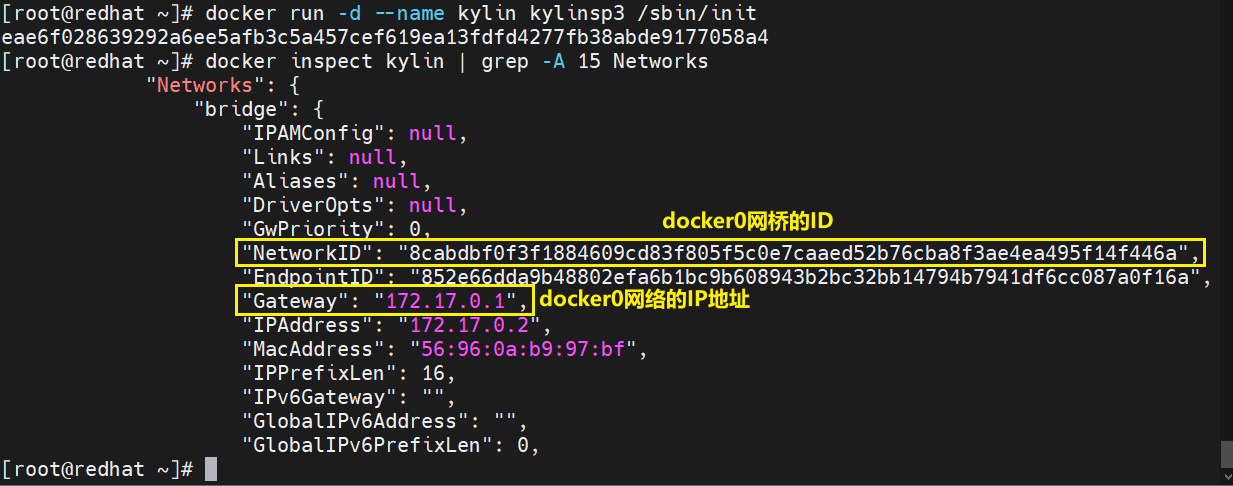 [root@redhat ~]# docker inspect kylin | grep -A 15 Networks