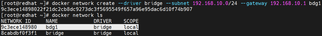 [root@redhat ~]# docker network create --driver bridge --subnet 192.168.10.0/24 --gateway 192.168.10.1 bdg1