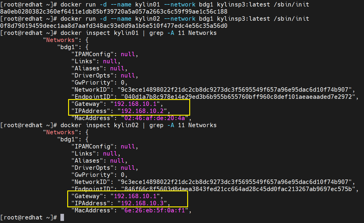 [root@redhat ~]# docker run -d --name kylin02 --network bdg1 kylinsp3:latest /sbin/init
