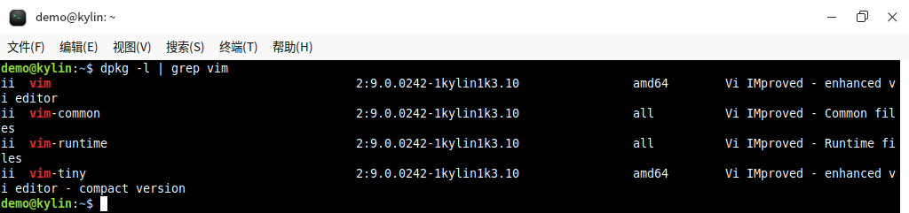 demo@kylin:~$ dpkg -l | grep vim # 类似 rpm -qa | grep vim
